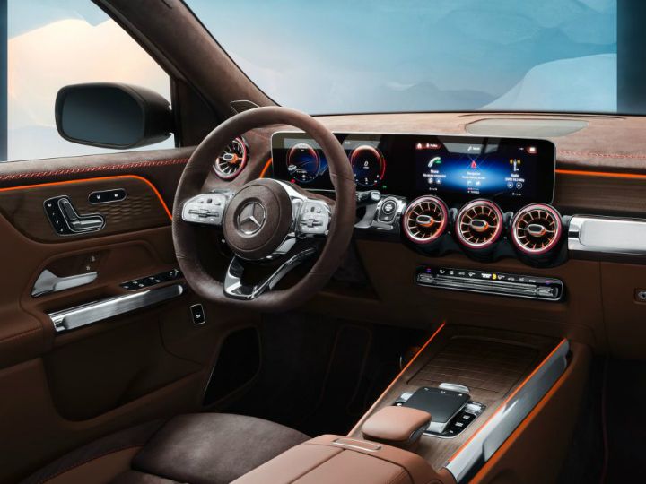 The SUV follows a different design path compared to what we have seen in the GLA and GLC. Gone are the swooping lines and low stance, the SUV now looks similar to the much bigger. The boxy front now has a huge twin-slat grille with the three-pointed star bang in the centre. Flanking the grille are multi-beam LED headlamps with eyebrow and a lower DRL element. Below that are a set of traditional fog lamps and funky looking air dams. In profile, the SUV looks muscular with squared wheel arches, tall stance, and 17-inch off-road tyres. All these features hint towards a capable off-roader. The concept also carries a pair of auxiliary lamps on the roof with a black roof box, door handles and ORVMs. The rear section also follows a boxy design language with split LED taillamps and an aluminum diffuser.