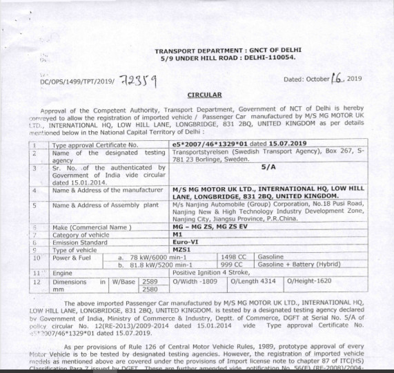 The document also reveals the dimensions of the SUV, measuring 4,314 mm in length, 1,809 mm in width, 1,620 in height, along with a wheelbase of 2,580-2,589 mm. This document also suggests the possibility of MG offering the non-electric ZS in India. We'll have to wait and watch to know for sure.